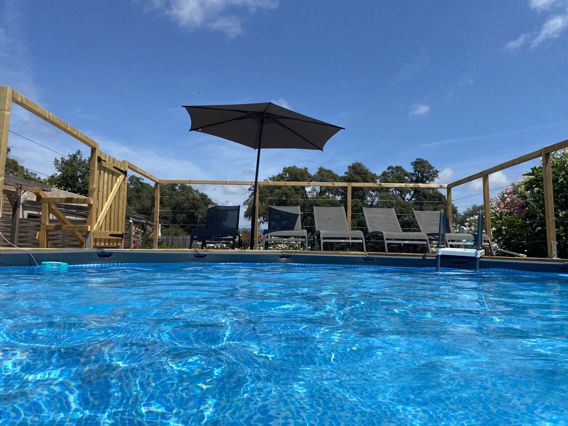 D'une piscine hors sol de 5.50 m de diamètre et de 1,30m de profondeur : chaises longues, parasol, ...