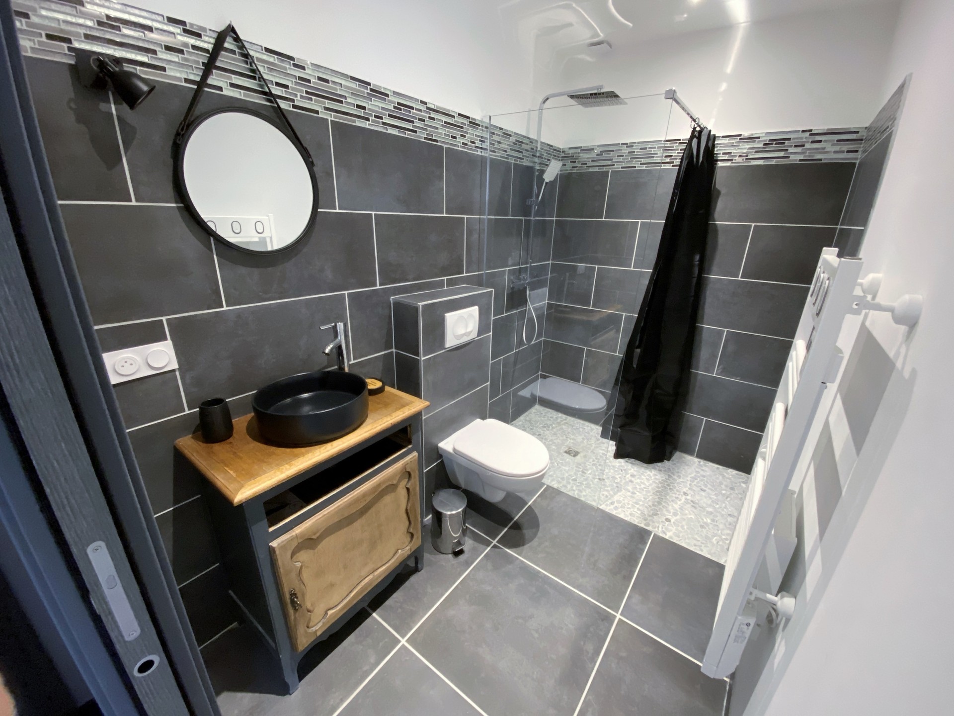 D’une salle d’eau, bénéficiant d’une douche à l’italienne, de WC et d’un lavabo, d'un meuble bas et d’un sèche-cheveux.