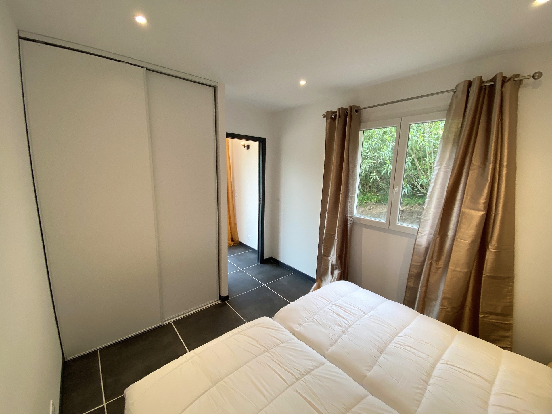 - D’une salle d’eau, bénéficiant d’une douche à l’italienne, de WC, d'un meuble vasque et d’un sèche-cheveux. - D’une chambre avec un lit en 140 cm, armoire murale, fer et planche à repasser. - D’une deuxième chambre avec deux lits en 90cm et une armoire murale.